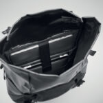 Rolltop backpack in 50C tarpaulin with padded back, base and shoulder straps reinforcement. Front zippered pockets.