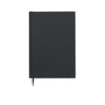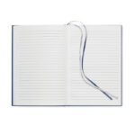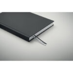 A5 journal notebook in 60% recycled post consumer polyester and 40% PU cover. Casebound. 256 lined pages in 70gsm recycled paper (128 sheets). With 2 polyester ribbon page markers.