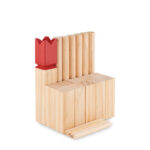 Pine wood throwing game presented in a cotton drawcord bag. This game, of Swedish and Scandinavian origin, is fun for kids, families or a group of friends and is commonly played outdoors. The goal is to knock over the larger wooden sticks by throwing the smaller ones at them. The centre piece, the king, will be knocked over last. The first one to knock them all over before the opponent does, wins. Includes 10pcs short square stick, 4pcs pointy stick, 6pcs round stick and 1pc King stick.