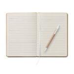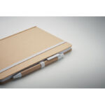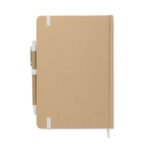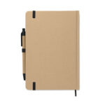 A5 märkmik kõva taaskasutatud pappkaanega. 160 joonega lehte (80 lehte taaskasutatud paberit). Elastne sulgemisrihm ja pliiatsi aas, lint järjehoidja. Sisaldab taaskasutatud paberist surunuppudega pastapliiatsit, millel on sinine tint