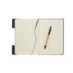 A5 RPET vildist kõvakaaneline märkmik telefonialuse funktsionaalsusega ja lisaks kuulub komplekti ka bambusest korpusega pastapliiats. 160 taaskasutatud paberist joonitud lehte (80 lehte). Elastne sulgemisrihm. Lindi järjehoidja. Sinine tint