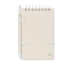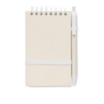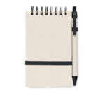 A6 Recycled milk cartons 70 sheet recycled plain paper notebook (70 % recycled milk carton and 30% recycled paper) with matching pen. Ring bound. Matching push button ball pen. Blue ink. Elastic closure strap and pen holder.