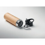 Double wall stainless steel insulating vacuum flask with bamboo outer cover and grip lid in PP. Capacity: 450ml. Keep your drinks cold or hot with this insulated bottle. Whether you love coffee, tea or other warm drinks, with this bottle you can easily bring it with you thanks to grip lid. The bamboo cover gives the bottle a natural look and makes it stand out from other bottles. Leak free. Bamboo is a natural product, there may be slight variations in colour and size per item, which can affect the final decoration outcome. FSC®-certified | FSC 100%, N5.7, FSC-C213206