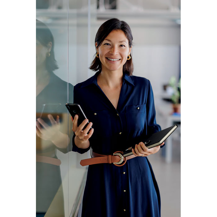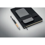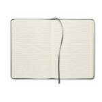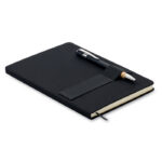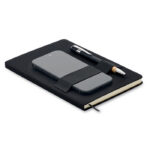 A5 notebook set with 600D RPET hard cover. Front elastic band phone holder function and front pen loop with push ball pen with bamboo grip detail. Case bound. 160 recycled paper lined pages (80 sheets). Includes envelope inside the back cover. Elastic closure strap. Ribbon bookmark. Blue ink. FSC®-certified | FSC MIX CREDIT, P7.1 , FSC-C213206