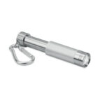 Mini aluminium and ABS LED key ring. The logo can be laser engraved and the light will illuminate the logo. 4 LR44 batteries included.