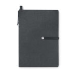 Recycled carton notebook with sticky notes pad and pen. Soft recycled carton cover noebook. Casebound. 140 lined pages (70 sheets). Large and medium sticky notes pads and 4 assorted colours page markers. Matching push button ball pen in recycled carton and ABS details. Black ink. Matching elastic closure strap. FSC®-certified | FSC MIX, P7.1, FSC-C213206