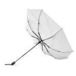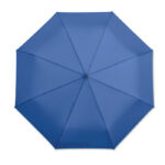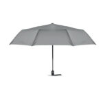 27 inch 3 fold auto open/close windproof umbrella. 190T pongee material black plated steel shaft. Fibreglass ribs, 1 part black plating inside frame. Black PP handle with button. With matching pouch.
