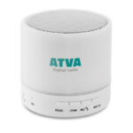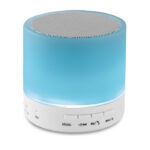 2.1 wireless speaker with LED light indication in ABS. 3 colours changing light. 1 Rechargeable Lithium 500 mAh battery included. Includes a SD card port and an AUX/ USB cable. Hands free call function. Output data: 3W, 4 Ohm. Playing time aprox. 2h.