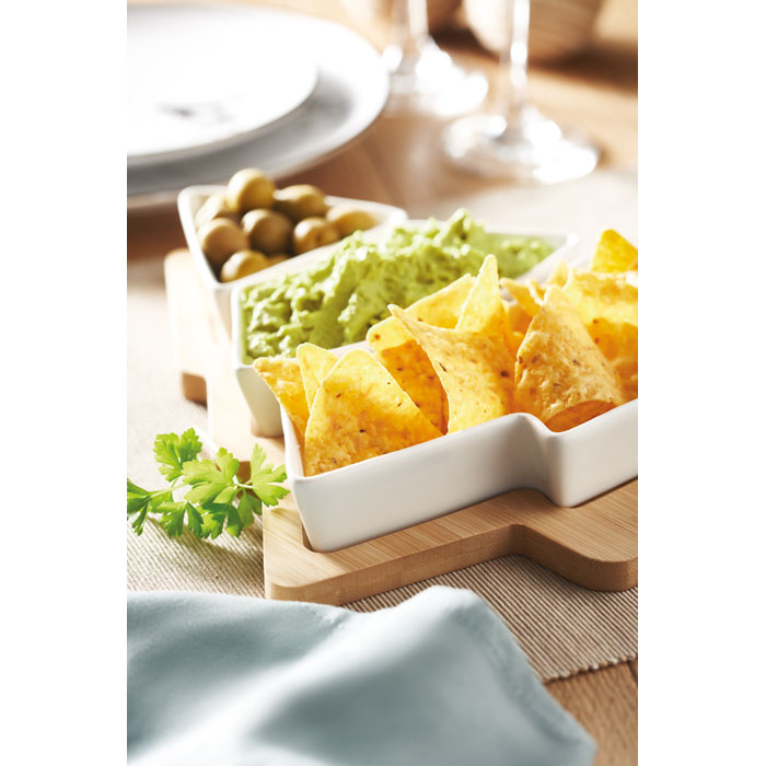 Kuusekujuline serveerimiskomplekt, mis koosneb kolmest väiksest kausist ja kuusekujulisest serveerimisalusest. Serveerimisalus on valmistatud bambusest