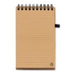 A6 notepad with cork cover. Twin-wire. 70 lined recyced paper sheets. Matching push button ball pen with recycled carton barrel and corn PLA details. Black ink. Elastic closure strap and pen holder. Cork is 100% natural material. Due to its structural nature and surface porosity the final print result per item may have deviations.