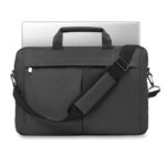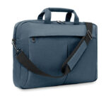 Laptop bag in 360D 2 tone polyester including one main internal compartment for 15 inch laptop and one zippered front pocket. Includes detachable and adjustable shoulder strap. Trolley holder on back side.