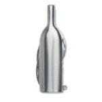 Roostevabast terasest veinipudeli kujuline taskunuga 6 funktsiooniga: pudeliavaja, nuga, korgitser, fooliumilõikur, luup ja võtmehoidja