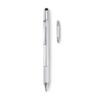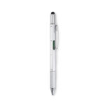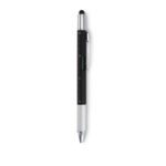 Twist action spirit level pen in ABS with ruler, stylus and phillips head and flat head screw driver bits. Black ink.