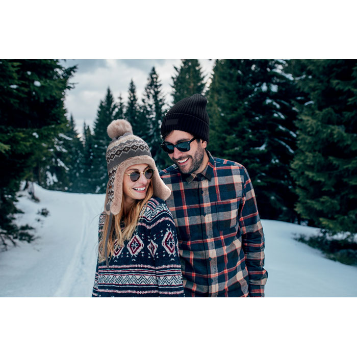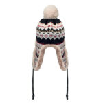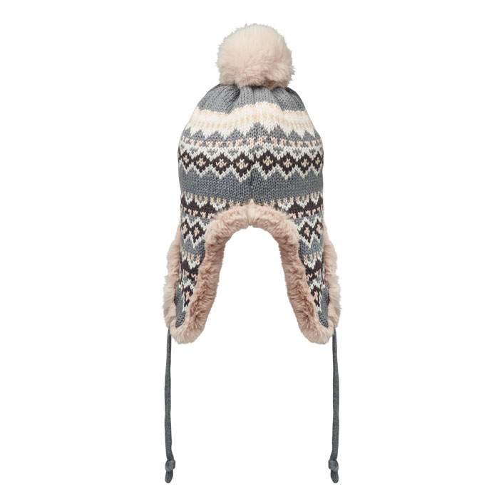 Knitted beanie with ear flaps and pompom in acrylic fibre with polyester and fleece lined. Includes label for printing area on one side. Adult size.