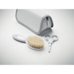 Beebihoolduskomplekt 6-osaline: pehme harjake, kamm, hambahari, küünenuga, küünekäärid ja käärid. Pakitud 600D polüestrist kotti