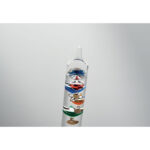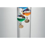Klaasist Galileo termomeeter viie värvilise ujukiga, puidust alusel. Mõõdab temperatuuri vahemikus 18–26 °C.