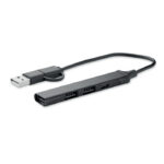 4 pordiga taaskasutatud alumiiniumist USB-jaotur. 3 USB-A + 1 tüüpi C. Sisend: 2-in-1 Type-C & Type-A. Kaabli pikkus: 19 cm