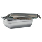 Taaskasutatud roostevabast terasest lõunasöögikarp taaskasutatud PP kaanega ja 4 küljekinnitusega. Kaasas vahesein toidu eraldamiseks. Mahutavus: 1500 ml