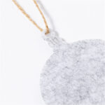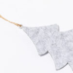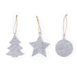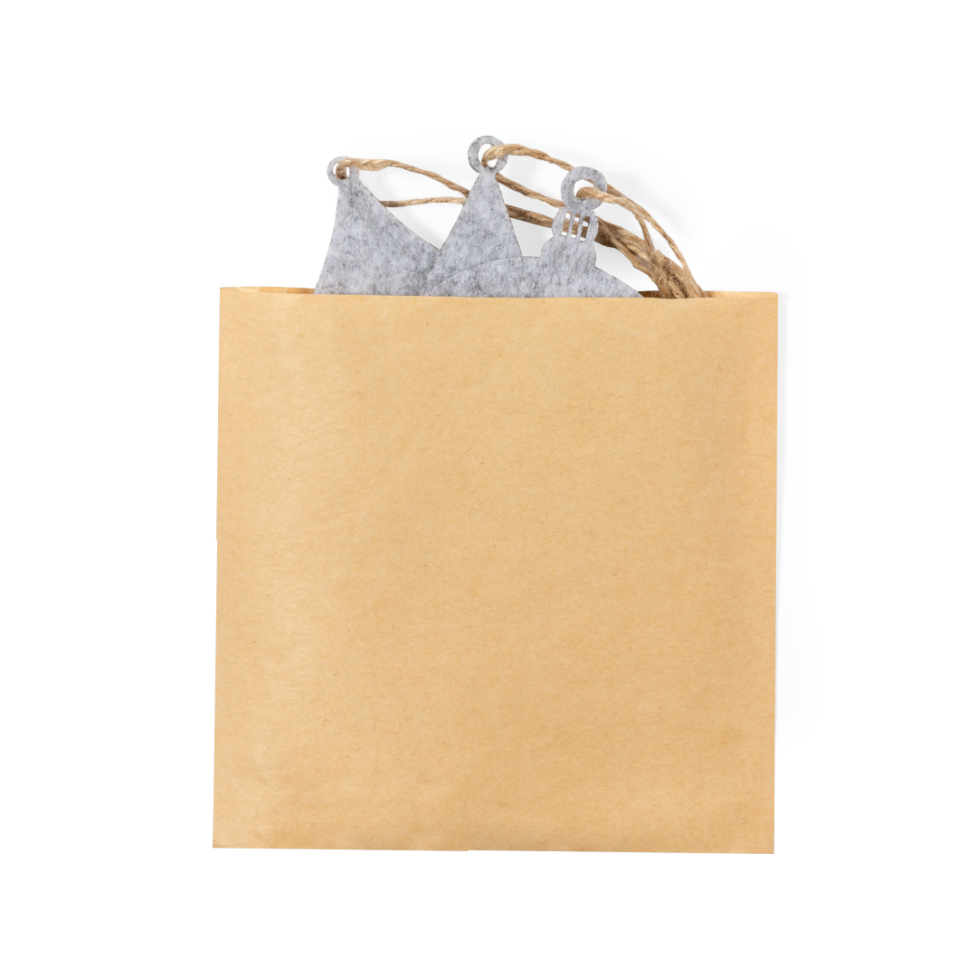 Kolm pehmet jõulukaunistust: kuusk, täht ja pall. Kõik kaunistused on riputatavad ja pakitud taaskasutatud paberkotti